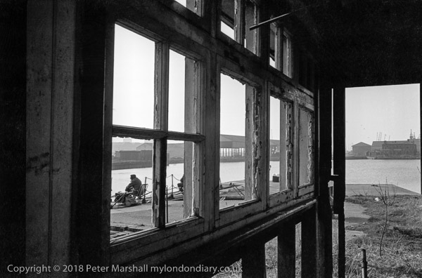 A view from inside one of the several derelict sheds in the area, this one had once had many windows to give a clear view of the dock entrance.