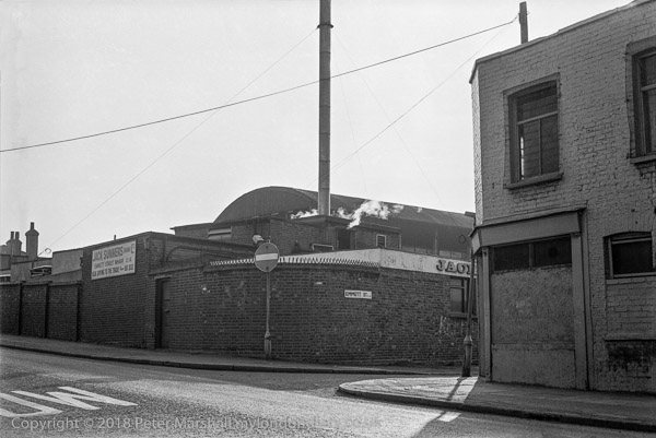 This is the same corner shop photographed by Izis which I wrote about earlier by looking at the side facing Westferry Rd. To the left of the picture is Jack Summers (Kilning) Ltd, Emmett St Wharf E14, which offers 'Kiln Drying to the Trade', and is clearly still in business, with steam escaping from around the base of its chimney.