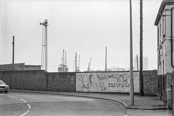A wider view of the welcome sign on Preston's Road, complete with a railway signal, perhaps for the branch down to the Midland Railway Wharf at Blackwall, and riverside cranes.