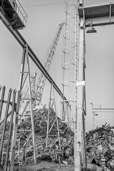 Angerstein Wharf, Scrap metal works, East Greenwich, Woolwich. 1982 30m-34:scrapyard, car parts, crane