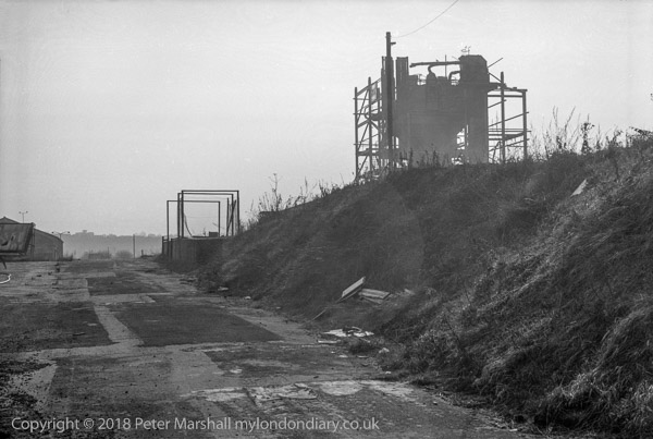 The view is looking south on a roadway in poor condition leading away from the Thames, and I think is probably Horn Way, or possibly Lombard Wall.