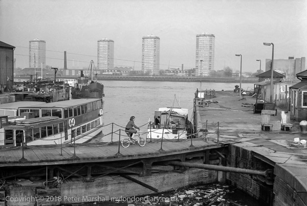Surrey Docks Urban Farm, Greenland Dock Entrance, Rotherhithe, Southwark. 1982 30p-15: urban farm, lock gate, dock river, cyclist, Thames, flats, boats,