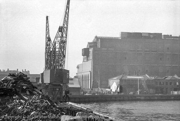 Deptford Creek, Scrap Metal and Power Station, Deptford, Greenwich. 1982 30q-42: creek, river, Ravensbourne, power station, wharf scrap metal