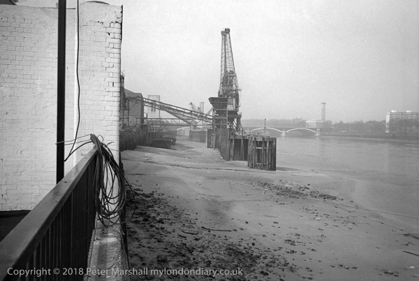 River Thames view upstream from Nine Elms, Wandsworth. 1982 30v-61: river, Thames, bridge, jetty, cranes, mud,