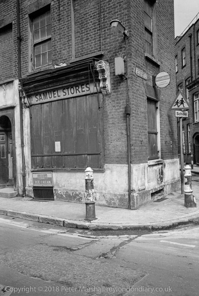 Samuel Stores, Artillery Lane / Gun St, Spitalfields, Tower Hamlets. 1982 30w-11: shop, corner shop, Jewish,