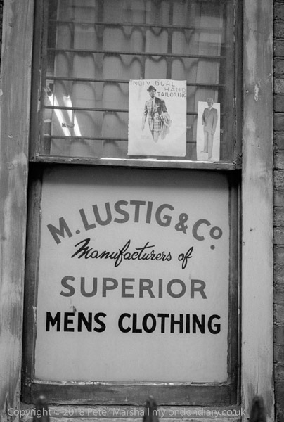 M Lustig & Co, Spitalfields, Tower Hamlets. 1982 30w-12: window, works, clothing, tailors, Jewish,