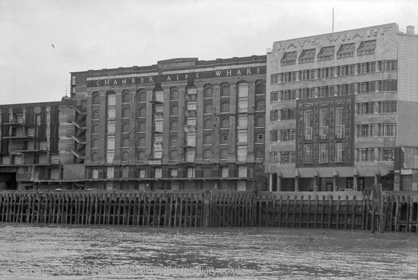 Chamberlains Wharf and Hays Wharf from the Thames, Southwark. 1982 31b-23: wharf, Thames, river, warehouse,