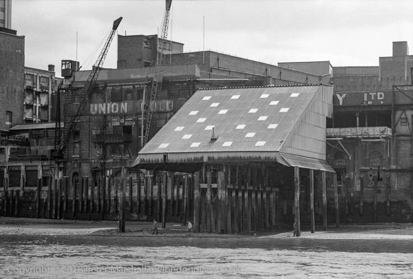 Union Cold Stores from the Thames, Southwark. 1982 31b-31: wharf, Thames, river, warehouse,