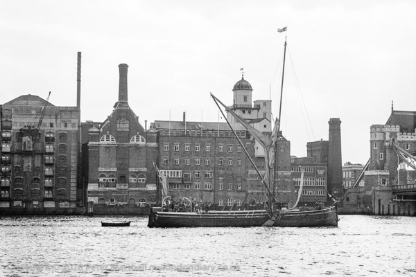 Sailing Barge & Anchor Brewhouse from the Thames, Southwark. 1982 31c-42: wharf, Thames, river, cold store, offices,