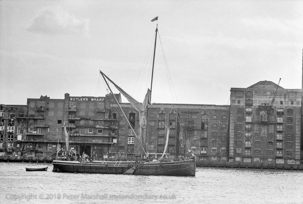 Sailing Barge & Butlers Wharf from the Thames, Southwark. 1982 31c-45: wharf, Thames, river, cold store, offices,