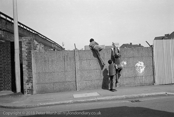 Boys climbing over wall, Tinworth St, Kennington, Lambeth. 1982 31k-43: railway, wall, boys,