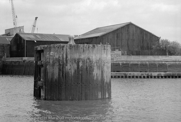 Dolphin, River Thames, Surrey Docks, Rotherhithe. 1982 31p-63: dolphin,, river, Thames, docks, sheds,
