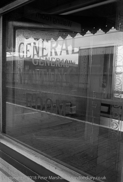 Stepney East Station, Tower Hamlets. 1982 32a-13: station, railway, waiting room, window, glass, etching
