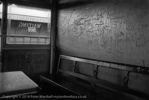 Stepney East Station, Tower Hamlets. 1982 32a-15: station, railway, waiting room, window, glass, etching, graffiti,