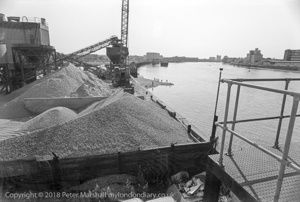 Sand and Gravel works from Wandsworth Bridge, Wandsworth. 1983 35n-24: sand, gravel, wharf, works, river, Thames,