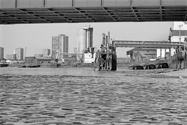 Battersea Riverside from the Thames, Wandsworth. 1983 35n-35; river, Thames, church, flat, works, pier, bridge