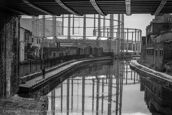 Regent's Canal, Corbridge Crescent and Gas Holders, Bethnal Green, Tower Hamlets. 1983 36n-13 gas holders, workshops, canal, bridge,