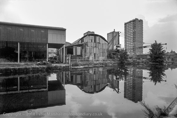 Timber Yard and flats, Hertford Union Canal, Tower Hamlets. 1983 36n22: canal, flats, timber yard