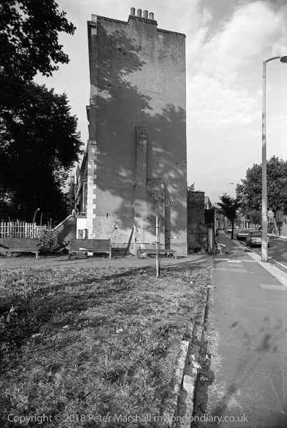 House on street corner, Old Ford Road/Approach Road, Bethnal Green, Tower Hamlets. 1983, 36u-63 street, house, tree, shadow