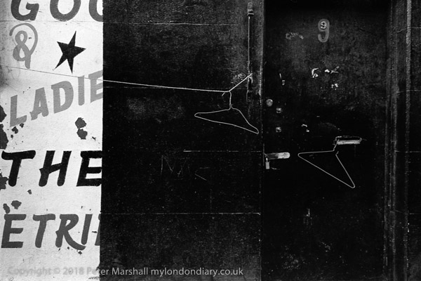 Detail, 7-9 Cheshire St, Spitalfields, Tower Hamlets. 1983 36z-34 shop, clothes hangers, sign,