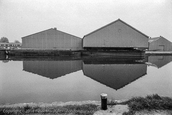 Canal Basin, Grand Union Canal, Brentford, Hounslow. 1983 37i-42 canal, barges, sheds,