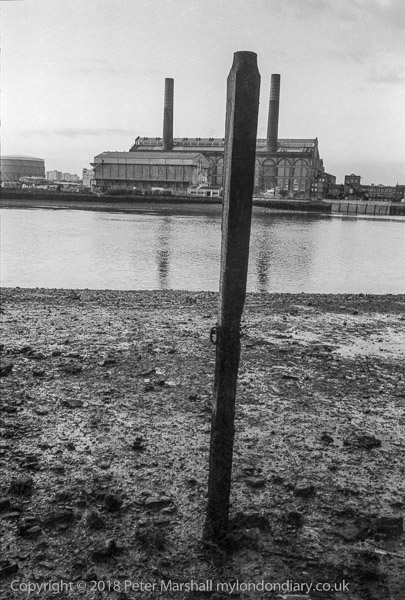 Lots Road Power station from Battersea, Wandsworth. 1983 37k-63 river, thames, power station, post, muds,