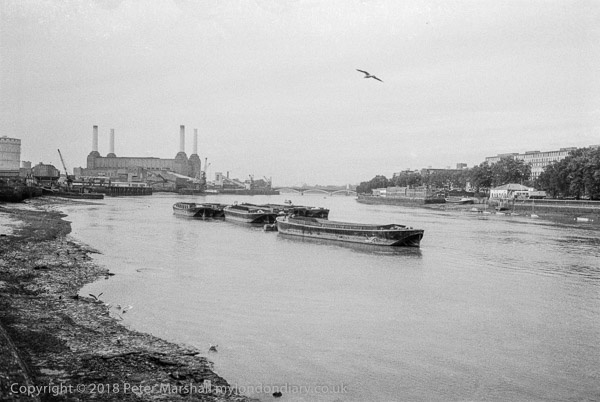 River Thames from Nine Elms, Wandsworth. 1983 37m-63 boat, ship, barge, river, Thames, bridge, power station, gas,